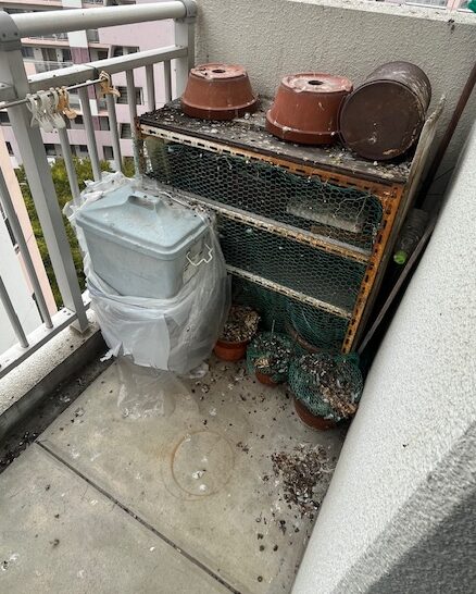 あるお客様からベランダに出ると、ハトの巣が!しかも周囲には大量のフンが…。見た目の問題だけでなく、ハトのフンには病原菌が含まれていることもあり、健康被害のリスクも。ハトはいなくて巣だけでしたのですぐに巣の撤去と清掃をいたしました。